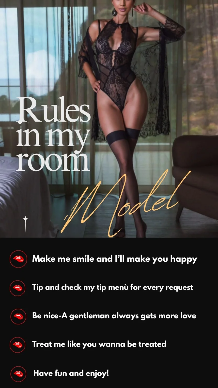 Blowjob, Camel Toe, Cuckold, Doggy Style, Facesitting, Fingering, Erotic Dance, Foot Fetish, Heels, Handjob, Humiliation, Jerk-off Instruction, Mistress, Nylon, Ahegao, Cock Rating, Corset, Cowgirl, Creampie, Deepthroat, Dildo or Vibrator, Dirty Talk, Facial, Flashing, Oil Show, Masturbation, Orgasm, Spanking, Striptease, Smoking, Squirt, Twerk, Tittyfuck, Topless, Sex Toys